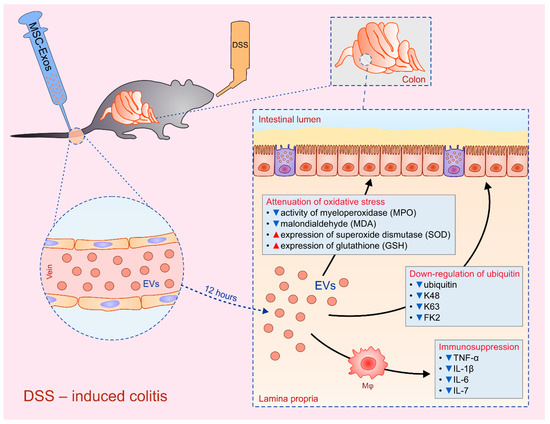 Therapeutic effects of MSC-derived secretome in attenuation of experimental colitis. Administration of MSC-sourced extracellular vesicles (EVs), including MSC-derived exosomes (Exos), efficiently alleviated dextran sodium sulphate (DSS)-induced colitis. Intravenous injection of MSC-EVs significantly decreased activity of myeloperoxidase (MPO), malondialdehyde (MDA) and notably increased expression of superoxide dismutase (SOD) and glutathione (GSH) in inflamed colons, indicating that modulation of anti-oxidant/oxidant balance in inflamed gut had important role for MSC-EVs-based therapeutic effects. Down-regulation of ubiquitin and ubiquitin-associated molecules (K48, K63 and FK2) in inflamed gut were also responsible for MSC-Exo-based attenuation of colitis. Additionally, MSC-derived secretome attenuated production of inflammatory cytokines (TNF-α, IL-1β, IL-6, IL-7) in colon macrophages resulting in alleviation of on-going inflammation.