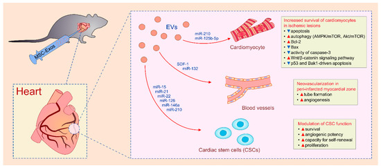 Administration of MSC-Exos significantly improved stem cell properties and regenerative potential of CSCs [119]. Survival, angiogenic potency and capacity for self-renewal were significantly improved in MSC-Exo-primed CSCs [119]. MSC-Exo-mediated modulation of CSC function has been attributed to the delivery of specific microRNAs (miR-15, miR-21, miR-22, miR-126, miR-146a, miR-210) which prevented apoptosis and promoted survival and proliferation of CSCs [110,119,120].