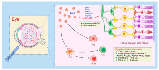 Molecular mechanisms responsible for beneficial effects of MSC-derived secretome in retinal regeneration. MSC-derived exosomes (Exos) promote regeneration of injured retina by supplying retinal ganglion cells (RGCs) with miR-17-92, miR-21, miR146a and neurotrophins (brain-derived neurotrophic factor (BDNF), nerve growth factor (NGF) and platelet-derived growth factor (PDGF)). MSC-sourced secretome suppress detrimental immune response in the eye through the inhibition of antigen-presenting cells (macrophages and dendritic cells (DCs)) which results in attenuated activation of Th1 and Th17 cells and alleviation of retinal injury and inflammation.