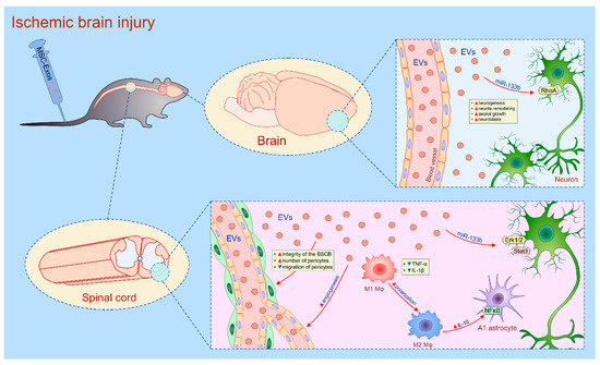 Molecular mechanisms responsible for beneficial effects of MSC-derived secretomes in the therapy of ischemic brain damage and spinal cord injury. Administration of MSC-sourced extracellular vesicles (EVs), including MSC-derived exosomes (Exos), promoted neural regeneration in animal models of ischemic brain damage and spinal cord injury (SCI). MSC-Exos-based therapy improved neurogenesis, promoted axonal growth, increased presence of neuroblasts and endothelial cells (ECs) in ischemic regions of the brain. MSCs-Exo regulated neurogenesis by supplying neurons with miR-133b which promoted neurite outgrowth by targeting Ras homolog gene family member A (RhoA). Similarly, systemic injection of miR-133b-bearing MSC-Exos promoted recovery from SCI by promoting regeneration of axons through the activation of survival Erk1/2 and Stat-3 signaling pathways in regenerating neurons. After intravenous administration, MSC-Exos accumulated at the site of SCI and promoted generation of immunosuppressive M2 macrophages which, in IL-10-dependent manner, suppressed activation of neurotoxic A1 astrocytes through the inhibition of NF-kB. In similar manner, via down-regulation of NF-κB p65 signaling, MSC-EVs reduced migratory capacities of pericytes and maintained structural integrity of blood-spinal cord barrier (BSCB).