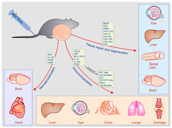 In addition to alleviation of myocardial ischemia/reperfusion injury, MSC-Exos efficiently attenuated dilated cardiomyopathy [121]. Significantly improved myocardial function, attenuated cardiac dilation and reduced apoptosis of cardiomyocytes were observed in animals that intravenously received MSC-Exos. Beneficial effects of MSC-Exos were mainly relied on their anti-inflammatory effects. MSC-Exos improved the inflammatory microenvironment in the hearts by regulating function of macrophages, which were crucially important for the development of myocardial inflammation in dilated cardiomyopathy. Systemic injection of MSC-Exos remarkably attenuated the total number of pro-inflammatory macrophages in the hearts and significantly decreased serum concentration of macrophage-derived inflammatory cytokines and chemokines which reduced influx of circulating inflammatory cells in the MSC-Exos treated hearts [121].