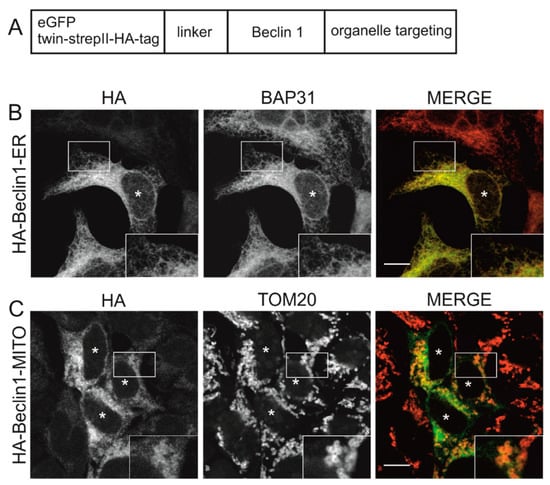 The following are available online at https://www.mdpi.com/2073-4409/8/5/475/s1: Figure S1: Subcellular localization of wild-type Beclin 1 in HEK293 cells inducibly expressing Twin-StrepII-HA-tagged Beclin 1; Figure S2: Colocalization of eGFP-Beclin 1-ER and eGFP-ER with ER markers calreticulin and protein disulphide isomerase (PDI), and Golgi marker GM130, in MEF-WT cells; Figure S3: Expression of eGFP-Beclin 1-ER in MEF-WT cells does not induce ER stress; Figure S4: Expression of eGFP-Beclin 1-MITO in MEF-WT cells does not induce mitochondrial stress as detected using tetramethylrhodamine ethyl ester (TMRE) to monitor membrane potential; Figure S5: Expression of Twin-StrepII-HA-Beclin 1-MITO in HEK293 cells does not induce mitochondrial stress as detected by OPA1 cleavage; Figure S6: Expression levels of Twin-StrepII-HA-Beclin 1 constructs in HEK293 cells; Figure S7: Effect of Beclin 1 constructs on p62 levels in HEK293 cells stably expressing Twin-StrepII-HA-tagged Beclin 1 constructs; Figure S8: Representative immunofluorescence images for the quantification of vesicular LC3 in non-expressing MEF-WT; Figure S9: Representative immunofluorescence images for the quantification of vesicular LC3 in MEF-ULK1/2-KO cells expressing eGFP-Beclin 1-WT; Figure S10: Higher magnification immunofluorescence images showing vesicular LC3 in MEF-ULK1/2-KO cells expressing eGFP-Beclin 1-ER and eGFP-Beclin 1-MITO; Figure S11: Representative immunofluorescence images for the quantification of vesicular LC3 in MEF-ULK1/2-KO cells expressing eGFP-Beclin 1-ER and eGFP-ER; Figure S12: Representative immunofluorescence images for the quantification of vesicular LC3 in MEF-ULK1/2-KO cells expressing eGFP-Beclin 1-MITO and eGFP-MITO; Figure S13: Representative immunofluorescence images for the quantification of colocalization between Twin-StrepII-HA-Beclin 1-WT and calreticulin in HEK293 cells; Figure S14: Representative immunofluorescence images for the quantification of colocalization between eGFP-Beclin 1-WT and BAP31 in MEF-WT cells; Table S1: List of oligonucleotide primers used for the assembly of the Beclin 1 constructs; Table S2: List of all detected Beclin 1 interactions, ranked by SAINT probability.