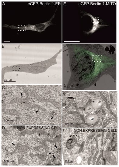 To confirm the subcellular localization of eGFP-Beclin 1-MITO in transiently transfected MEF, we performed immunofluorescence with antibodies against TOM20. Both eGFP-Beclin 1-MITO and eGFP-MITO control (Figure 2B) substantially colocalized with TOM20 as expected. Unlike the stable expression of Twin-StrepII-HA-Beclin 1-MITO in HEK293 cells, the transient expression of eGFP-Beclin 1-MITO, but not eGFP-MITO, in MEF had a profound effect on the subcellular localization of mitochondria, causing them to accumulate in the perinuclear area (Figure 2B, upper panel). We quantified this using point counting to estimate the area covered by mitochondrial staining in HeLa cells expressing eGFP-Beclin 1-MITO or eGFP-MITO construct (data not shown). The quantification showed that in cells expressing eGFP-Beclin 1-MITO, 45.8% of the cell area was covered by mitochondria, while in non-expressing cells and eGFP-MITO-expressing cells mitochondria covered 71.6% and 69.8% of the cell area, respectively. We also performed CLEM to study whether mitochondrial morphology was changed in the cells expressing eGFP-Beclin 1-MITO. The analysis showed that mitochondrial ultrastructure was normal despite their clustering around the nucleus (Figure 3E–H). Of note, in cells expressing eGFP-Beclin 1-MITO, mitochondria showed contacts with lipid droplets, but we did not observe signs of lipophagy, nor increased mitophagy (Figure 3G). Non-expressing cells from the same sample were imaged for comparison (Figure 3H). Mitochondrial ultrastructure was similar in cells expressing eGFP-Beclin 1-MITO (Figure 3G) and in non-expressing cells (Figure 3H).