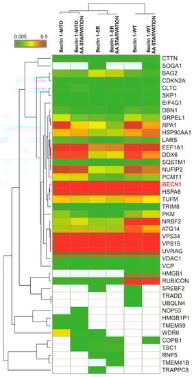 To verify that the Beclin 1-ER and Beclin 1-MITO constructs are still able to bind the known autophagy-associated binding partners of Beclin 1, we performed affinity-purification followed by mass spectrometry using the stable HEK293 cell lines expressing the targeted Beclin 1 constructs. We used both non-starved and amino-acid starved cells in these experiments [5,13,45,46]. Cells expressing Twin-StrepII-HA-Beclin 1-WT, Twin-StrepII-HA-Beclin 1-ER or Twin-StrepII-HA-Beclin 1-MITO were induced with tetracycline for 24 h prior to the experiments. Beclin 1 complexes were purified from cell extracts using Strep-Tactin beads and analyzed by mass spectrometry. The results are summarized as a heat map in Figure 4, and the data is presented as Supplementary Table S2. Our results revealed a number of high-confidence interacting proteins (HCIPs) for the Beclin 1 constructs. The prey proteins are shown with their corresponding bait normalized abundance, and they cluster hierarchically into groups, indicated by the brackets on the left side of the heat map (Figure 4). The three Beclin 1 constructs were also clustered in order to show their interaction profiles. The results showed that Beclin 1-ER and Beclin 1-MITO formed expected molecular interactions similar to Beclin 1-WT.
