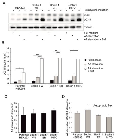In order to study the effects of the targeted Beclin 1 constructs on autophagy in the stable HEK293 cell lines, we monitored LC3 lipidation using Western blotting. The same samples that were run to test the expression levels of the HA-tagged Beclin 1 constructs were used in these experiments. Three different treatments were used: full medium, serum and amino acid starvation for 2 h (AA starvation), and serum and amino acid starvation with bafilomycin A1 for 2 h (AA starvation + Baf). Bafilomycin A1 blocks the lysosomal proton pump, and thus it prevents the maturation and clearance of autophagosomes, revealing information on autophagic flux. Compared to parental HEK293 cells, stable expression of all Beclin 1 constructs increased the levels of the autophagosome-associated form of LC3, LC3-II, in both full medium and AA starvation (Figure 5A,B).