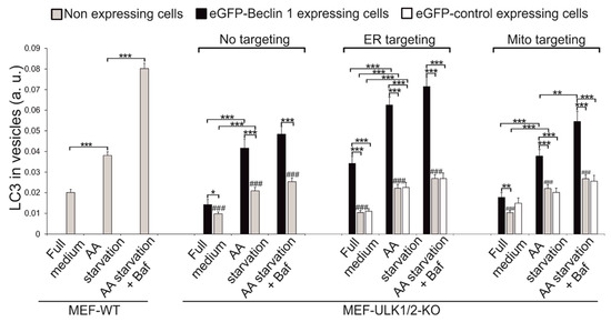 Quantification of LC3 labelling in MEF-WT and MEF ULK1/2-KO cells expressing the eGFP-tagged constructs. MEF-ULK1/2-KO cells were transfected with eGFP-Beclin 1-WT, eGFP-Beclin 1-ER, eGFP-ER, eGFP-Beclin 1-MITO, or eGFP-MITO. Cells were kept in full medium or starved in amino-acid (AA) free medium for 1 h with or without 100 nM bafilomycin A1, fixed and labelled with LC3 antibody. CellProfiler was used to quantify the proportion of LC3 in vesicles, both in cells expressing the eGFP-tagged constructs and in non-expressing cells in the same sample. Results are shown as mean and SEM of 50 eGFP-tagged construct expressing cells and 150 non expressing cells (N = 50 and N = 150, respectively). One-way ANOVA followed by Tukey Kramer post hoc test was used to test statistical significance. * p < 0.05, ** p < 0.01, *** p < 0.001 for comparisons within cell lines. ### p < 0.001 for non-expressing MEF-ULK1/2-KO cells compared to non-expressing MEF-WT cells under the same condition.