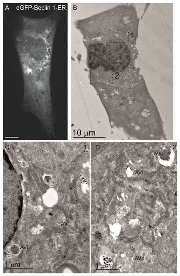 To further confirm these results, and to study the ultrastructure of the autophagosomes in MEF-ULK1/2-KO cells expressing the Beclin 1 constructs, we used CLEM. Electron microscopy showed that MEF-ULK1/2-KO cells expressing eGFP-Beclin 1-WT or eGFP-Beclin 1-MITO (Figure 7) contained autophagic structures whose morphology was identical to autophagic structures in normal amino-acid starved cells [51]. Similar observations were done for MEF-ULK1/2-KO cells expressing eGFP-Beclin 1-ER (Figure 8).