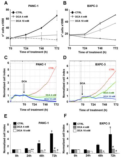 Effect of dichloroacetate (DCA) on cell growth and proliferation. Cell growth curves of cultured PANC-1 (A) and BXPC-3 (B) seeded at the same density, cultured for 72 h without CTRL (black line) or with 4 mM DCA (gray line) and 10 mM DCA (dotted line). Cells were counted every 24 h and the values shown are means ± SEM of three independent time courses. Dose- and time-dependent effect of DCA treatment on PANC-1 (C) and BXPC-3 (D) proliferation assessed using xCELLigence system. A representative profile for both cell lines is shown, indicating the cell index normalized to the last cell index recorded before DCA addition, measured in real time for 72 h. Normalized cell index quantified in PANC-1 (E) and BXPC-3 (F) cells treated with DCA indicated as mean ± SD of three independent experiments, recorded at the indicated time points. Analysis was conducted using one-way Anova and Bonferroni post-test. * p < 0.001 vs. CTRL; ** p < 0.05 vs. CTRL 24h; ° p < 0.001 vs. CTRL 48 h; # p < 0.001 vs. CTRL 72 h.