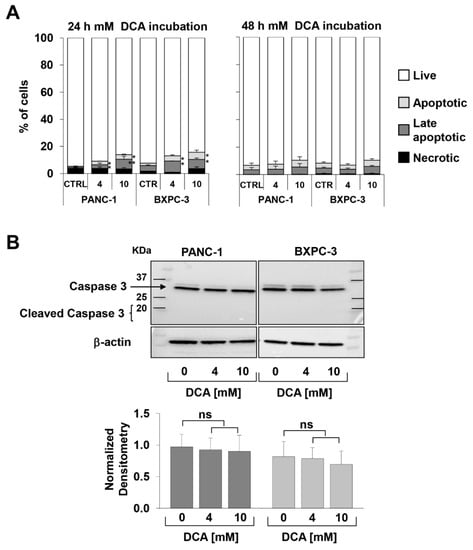 Analysis of the viability parameters in both the DCA-treated PDAC cell lines unveiled a limited percentage of apoptotic/necrotic cells, thereby suggesting a cytostatic rather than a cytotoxic effect exerted by the drug, confirming previous reports [,].
