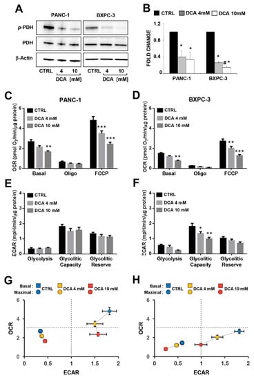 Effect of DCA on pyruvate dehydrogenase E1-alpha (PDH) phosphorylation and metabolic fluxes, (A) a representative immunoblotting of the phospho-S293 E1αPDH (pPDH) and total enzyme subunit in PANC-1 and BXPC-3 cells following 24 h incubation with DCA 4 mM and 10 mM, β-actin was used as loading control; (B) quantitative analysis of the densitometric values of phospho-S293 E1αPDH relative to total PDH, normalized to β-actin, the results are the means ± SEM of three independent experiments, * p < 0.05 vs. CTRL, # p < 0.05 vs. BXPC-3 DCA 4 mM; (C,D) oxygen consumption rate (OCR) performed by the SeaHorse platform as described in the Material and Method section and normalized to the protein content of the cells at the end of the assay, basal: resting OCR; oligo: OCR measured after the addition of the ATP synthase inhibitor oligomycin; FCCP: OCR measured after the uncoupler FCCP producing the maximal respiratory capacity, the OCR was corrected for the residual OCR measured after the addition of the CxI inhibitor rotenone (not shown); (E,F) extracellular acidification rate (ECAR) measured in PANC-1 and BXPC-3 treated with DCA 4 mM and 10 mM for 48 h, glycolisis: resting ECAR; glycolitic capacity: ECAR measure after the addition of olygomycin and FCCP and refers to maximal glycolytic activity with the OxPhos inhibited; glycolytic reserve: difference between ECAR measured in the presence of oligomycin + FCCP and under resting conditions, the bars represent the means ± SEM of 3 independent experiments carried out in 3 technical replicates under each condition (* p < 0.05, ** p < 0.01, *** p < 0.001 vs. respective CTRL); (G,H) energy maps obtained plotting basal and maximal ECAR and OCR capacities obtained in PANC-1 and in BXPC-3, respectively.