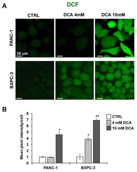 Next, we imaged the two PDAC cell lines for their redox tone using the peroxide probe DCF. Figure 5A,B show that the 10 mM DCA treatment for 24 h caused a significantly large increase of the DCF-related signal in both PANC-1 and BXPC-3 cell lines as compared with their untreated basal levels. This result indicated a pro-oxidative unbalance or the redox state caused by DCA exposure.