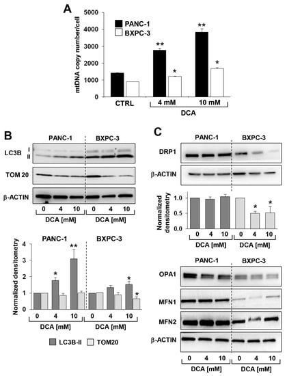 Next, we assessed by immunoblotting the expression level of proteins known to be involved in the mitochondrial clearance (i.e., mitophagy) and dynamics. Figure 6B,C show that the expression of the autophagosome marker LC3B-II was significantly higher in BXPC-3 than in PANC-1, and that DCA caused a dose-dependent progressive increase of the marker in both cell lines. However, TOM20, a marker of the outer mitochondrial membrane, significantly decreased only in the BXPC-3 cell line.