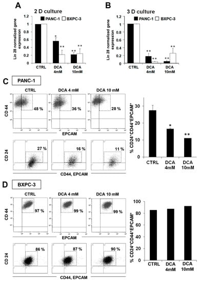 Effect of DCA on PANC-1 and BXPC-3 cancer stem cell markers, (A) quantitative RT-PCR analysis of Lin28 transcript performed in PANC-1 and BXPC-3 grown in monolayer for 24 h with DCA 4 mM and 10 mM, the values are the mean ± SEM of three independent experiments (* p < 0.05 vs. CTRL, ** p < 0.01 vs. CTRL); (B) quantitative RT-PCR analysis of Lin28 transcript performed in PANC-1 and BXPC-3 spheroids cultured for 7 days and treated with DCA for 72 h, the values are the mean ± SEM of three independent experiments (** p < 0.01 vs. CTRL); (C) representative dot plot analysis of CD44 (y axis) and EPCAM (x axis) expression in PANC-1 (upper tripartite panel) treated with DCA 4 mM and 10 mM for 24 h, the lower tripartite panel shows the corresponding expression of CD24 in CD44+/EPCAM+ cells; (D) representative dot plot analysis of CD44 (y axis) and EPCAM (x axis) expression in BXPC-3 (upper tripartite panel) treated with DCA 4 mM and 10 mM for 24 h, the lower tripartite panel shows the corresponding expression of CD24 in CD44+/EPCAM+ cells; the percentage in each dot plot of (C) and (D) of CD44+/EPCAM+ and CD24+/CD44+/EPCAM+ cells is shown; the histograms on the right of (C) and (D) show the mean ± SEM of CD24+/CD44+/EPCAM+ positive cells (expressed as percentage of total analyzed events) of at least three experiments; * p < 0.05, ** p < 0.01 vs. CTRL.