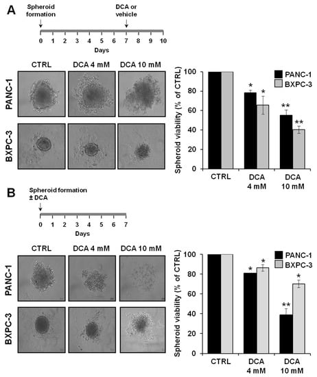 We also investigated the ability of DCA to affect spheroid formation by treating cell suspension at seeding. As shown in Figure 8B, DCA strongly affected spheroid formation in both of the PDAC cell lines, with PANC-1 resulting more sensitive to the drug. Accordingly, cell viability of PANC-1 spheroids was significantly more affected than that of BXPC-3 spheroids.