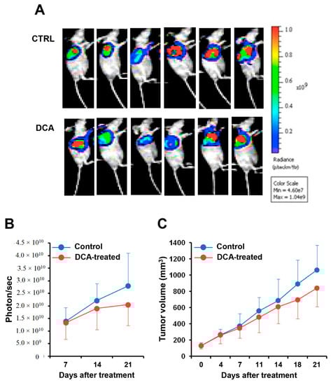 We finally evaluated the effect of DCA administration in a xenograft pancreatic cancer mouse model. Luciferase-expressing BXPC-3 cell line was injected into nude mice and after reaching a volume of 100 mm3 were treated with DCA or vehicle for three weeks. Figure 9A shows the bioluminescence imaging of the tumor mass in DCA-treated and control mice. Quantification of the bioluminescence signal revealed a retarded progression of the pancreatic tumor in the DCA-treated mice documented by a 25–30% reduction both of the intensity of the bioluminescence signal of the tumor mass and of its volume as compared with vehicle-treated mice (Figure 9B,C). However, because of the large interindividual variability the differences did not reach statistical significance.