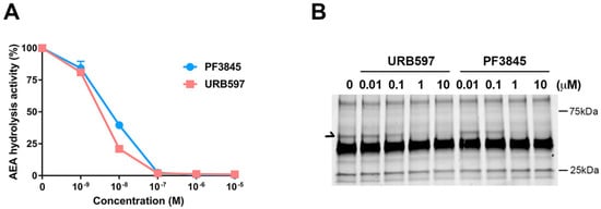 Characterization of the fatty acid amide hydrolase (FAAH) inhibitors URB597 and PF3845. AEA hydrolytic activity in BV2 membrane in the presence of inhibitor was assayed by measuring radioactive ethanolamine production by hydrolysis from [14C]-AEA. The plots for PF3845 dose response as a blue line and URB597 as an orange line are represented as relative activity with means ± S.D. (n = 3) (A). Activity-based protein profiling probe (ABPP), using the FP-TAMRA serine hydrolase probe, was performed in BV2 membrane fraction after treatment with the FAAH inhibitors. Arrow indicates the signal corresponding to FAAH (B).