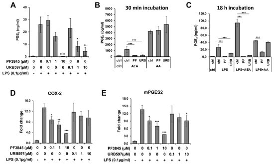 PGE2 is a typical lipid mediator that is induced in response to inflammation. To examine the effects of FAAH inhibitors on inflammation, production of PGE2 was measured in BV2 cells treated with the FAAH inhibitors under the LPS treatment condition. Both PF3845 and URB597 dose-dependently reduced the production of PGE2 after 18 h incubation (Figure 2A). To determine whether the two inhibitors block the inducible PGE2 biosynthetic enzymes directly, the BV2 cells, which were previously incubated with LPS overnight to induce biosynthetic activity, were treated with the inhibitors for a short period of time (30 min). In the presence of AA, PGE2 production was not inhibited by either of these inhibitors; however, it was completely blocked when AEA was used as a substrate (Figure 2B). These results suggest that the FAAH inhibitors blocked FAAH, which converts AEA to AA, but did not directly inhibit the enzymes that metabolize AA to PGE2. Conversely, when cells were incubated with LPS and FAAH inhibitor in the presence of AA or AEA for a long period of time (18 h), PGE2 production was substantially inhibited by PF3845 not only in the presence of AEA but also in the presence of AA (Figure 2C). The reduction of PGE2 in the presence of AA was not affected by URB597. These results indicated that PF3845 could suppress PGE2 synthesis after 18 h treatment. Consistently, the mRNA expression of the chief PGE2 synthetic enzymes, cyclooxygenase-2 (COX-2) and microsomal PGE synthase 2 (mPGES2), was reduced dose-dependently after 18 h incubation with PF3845, whereas URB597 did not attenuate the expression of COX-2, and only at 10 µM did it show partial inhibition on the expression of mPGES2 (Figure 2D,E).