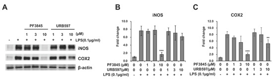 To determine the effect of FAAH inhibition on inflammatory enzymes, protein expression of inducible nitric oxide synthase (iNOS) and COX-2 after incubation with LPS and inhibitor for 18 h was examined by western blotting (Figure 3A). Figure 3B,C showed the protein expression levels of iNOS and COX-2 relative to β-actin. Both enzymes were substantially reduced to nearly basal level by 10 µM of PF3845 (80% and 70% reduction in iNOS and COX-2, respectively). URB597 (10 µM) suppressed the expression of iNOS slightly and the expression of COX-2 by 50%.