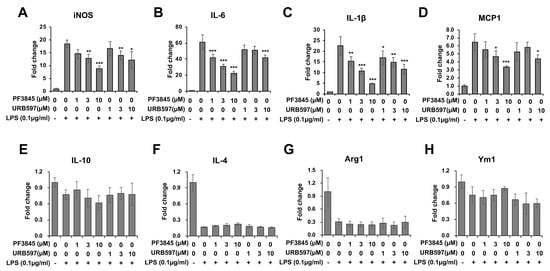 Next, we examined the mRNA expression of M1 and M2 markers including inflammatory cytokines at 8 h following LPS and inhibitor treatments (Figure 4). The expression of iNOS (Figure 4A) was suppressed by both PF3845 (up to 50% reduction) and URB597 (up to 30% reduction). All pro-inflammatory cytokines were reduced in a dose-dependent manner by PF3845 and URB597 with up to 60% and 30% reduction in IL-6 (Figure 4B), 80% and 50% reduction in IL-1β (Figure 4C), and 50% and 30% reduction in MCP1 (Figure 4D). The expression of the representative M2 markers, IL-10 (Figure 4E), IL-4 (Figure 4F), arginase-1 (Figure 4G), and Ym1 (Figure 4H) was reduced by LPS, but neither of the inhibitors blocked this reduction in LPS-treated cells.