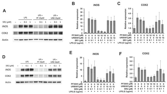 The anti-inflammatory mechanism by FAAH inhibitors was characterized by treatment with antagonists for CB receptors. Co-incubation with the CB1 receptor antagonist, SR141716 (SR1), did not reverse the reduction of COX-2 or iNOS expression caused by the FAAH inhibitors (Figure 5A–C). The CB2 receptor antagonist, SR144528 (SR2), also did not affect the expression of COX-2 or iNOS (Figure 5D–F). In the presence of URB597, neither CB1 nor CB2 receptor antagonist showed any clear effects due to large sample variations and partial inhibition by URB597. Effect of the antagonists was also assessed based on the generation of reactive oxygen species (ROS) using DCF-DA (Supplementary Figure S1). ROS production was dose-dependently suppressed by PF3845 and reduced to near basal level at 1 µM PF3845. However, the suppression of ROS was not reversed by the CB receptor antagonists. ROS production was further reduced by co-treatment with SR1, suggesting that SR1 per se may also have anti-inflammatory effects as we previously reported [37]. Thus, the CB receptors were not involved in the anti-inflammatory response of FAAH inhibition based on ROS production and protein expression of the inflammatory enzymes.