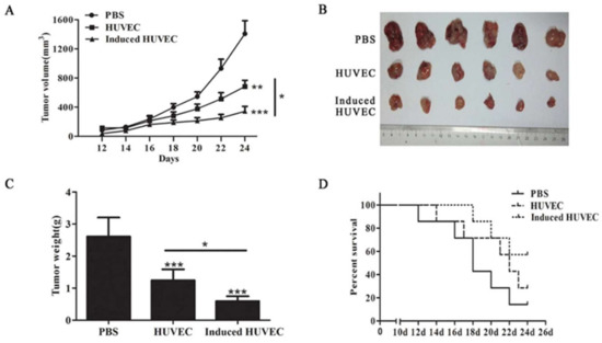 Fixed xenogeneic endothelial cells have been applied as a vaccine in the immunotherapy of tumors such as lung cancer, hepatoma, and colorectal carcinoma [8,12,30]. To inspect the antitumor effect of HUVECs induced by TCM, we adopted the murine colorectal carcinoma animal model. After immunization, 1 × 105 CT26 cells were injected subcutaneously into mice. Tumor dimensions were measured every other day after day 12. The tumor volume in the induced HUVEC group was significantly lower than that in the HUVEC group (p < 0.05) (Figure 2A). Mice were executed on day 24, and the tumors were stripped (Figure 2B). The tumor weight in the induced HUVEC group was significantly lower than that in the HUVEC group (p < 0.05) (Figure 2C). Meanwhile, survival monitoring experiment showed that induced HUVEC vaccine prolonged survival of tumor-bearing mice to some extent (Figure 2D). These results suggest that HUVEC induced by TCM has a better suppressive effect on tumor growth than the HUVEC vaccine.