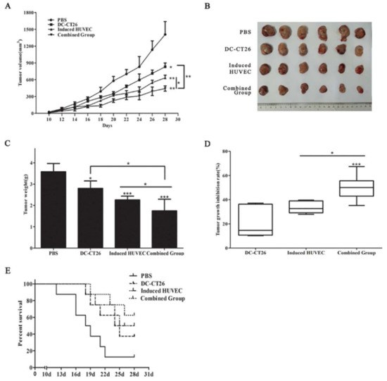 The combination of DC-CT26 with induced HUVECs possessed better antitumor effects than the two single-vaccine groups. (A) Tumor growth was measured every other day after day 10. (B) Tumors of each group were photographed after being stripped from mice. (C) Tumor weight was tested after removal from mice. (D) Tumor growth inhibition rate was calculated from the results of tumor weight. (E) Survival data of each group was compared, (* p < 0.05; ** p < 0.01; *** p < 0.001).