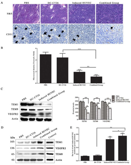 To explore the mechanism of the better effect of the combined group, the status of angiogenesis was evaluated by immunohistochemistry. The results revealed that the microvessel density of the combined group was obviously less than that of the DC-CT26 group and the induced HUVEC group (p < 0.001, p < 0.01, respectively) (Figure 5A,B). Because DCs were reported to directly interact with B lymphocyte to induce germinal center and antibody responses, the anti-angiogenesis effect of the combined vaccine might be promoted by the enhanced humoral immunity response [33]. By analyzing expression of the tumor vascular endothelial cell markers TEM1, TEM8, and VEGFR2 in the tumor tissues, the results demonstrated that angiogenesis in the experimental groups, especially in the combined group, was significantly lower than that in the two single-vaccine groups (Figure 5C).