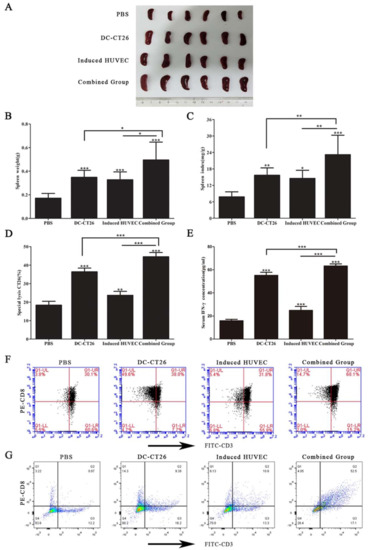 Immunization with DC-CT26 and induced HUVECs increased the immune function of the spleens. (A) The picture of the spleens was taken after removal from the mice; (B) the weight of the spleens was recorded; (C) the spleen index was calculated; (D,E) the lysis effect of tumor-specific CTL and the concentration of IFN-γ were tested; (F) the percentage of CD3+CD8+T cells from flow cytometry represented the level of specific cellular immune response; (G) the percentage of CD3+CD8+ T cells infiltrated in the tumors was detected by flow cytometry, (* p < 0.05; ** p < 0.01; *** p < 0.001).