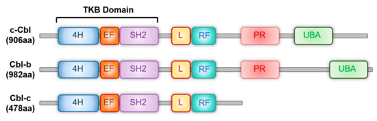 The primary structure and domain organization of human Casitas b-lineage lymphoma family proteins. c-Cbl, Cbl-b and Cbl-c proteins contain highly conserved tyrosine kinase-binding (TKB), linker (L), RING finger (RF) and proline-rich (PR) domains. 4H: Four-helix bundle; EF: EF hand, SH2: Src-homology 2; UBA: Ubiquitin-associated domain.