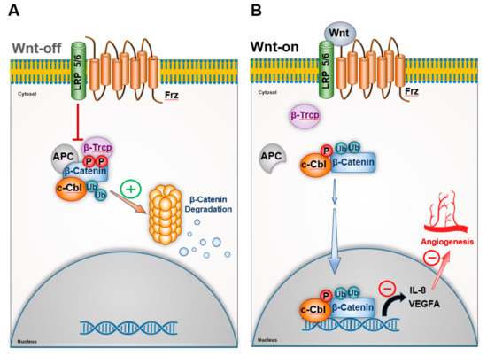 Under normal circumstances, canonical Wnt signaling is constitutively inhibited by the degradation of β–catenin (Wnt-off phase) [58]. Binding of the Wnt ligand to its cogent receptor stabilizes β–catenin, which undergoes nuclear translocation (Wnt-on phase). The pro-angiogenic function of Wnt signaling is largely driven by nuclear β–catenin in Wnt-on phase. Work of Chitalia et al demonstrated that c-Cbl directly interacted and suppressed β–catenin in both Wnt-off and Wnt-on phase in the endothelial cells in different subcellular compartments [21] (Figure 2).