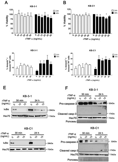 Analysis of parental and multidrug resistance (MDR) cell viability after recombinant human tumor necrosis factor-alpha (rTNF-α) treatment. Cell viability determined by (A,B) MTT assay and (C,D) annexin-V positive staining after 24 or 48 h of rTNF-α treatment in different concentrations. Immunoblot analysis of (E) IκBα, (F) pro-caspase-3 and cleaved caspase-3 protein levels determined after 30 minutes or 24 h of 10 or 15 ng/mL rTNF-α treatment. Data are means ± SD of three independent experiments. One-way ANOVA with Dunn’s posttest and t-tests were used to analyze the MTT assay and annexin-V staining results, respectively. * p < 0.05 indicates the statistical significance of data compared to non-treated cells.
