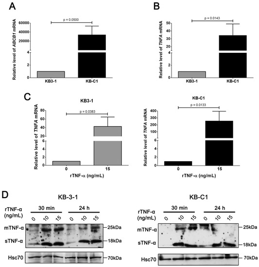 Endogenous TNF-α expression levels in parental and MDR cell lines after recombinant TNF-α treatment. Comparison between KB-3-1 and KB-C1 cells in (A) ABCB1 and (B) TNFA mRNA levels determined by real time quantitative PCR (qRT-PCR). (C) TNFA mRNA levels after 24 h of 15 ng/mL rTNF-α treatment determined by qRT-PCR. (D) Immunoblot analysis of endogenous TNF-α protein levels after 30 minutes or 24 h of 10 or 15 ng/mL rTNF-α treatment (transmembrane—tmTNF-α; soluble—sTNF-α forms). * p < 0.05 indicates the statistical significance of data compared with non-treated cells. Data are means ± SD of three independent experiments. * p < 0.05; ** p < 0.01 indicates the statistical significance of data compared with parental or non-treated cells. t-test was used to analyze the qRT-PCR results.