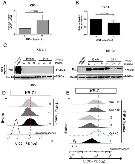 P-glycoprotein (Pgp) expression levels analysis in parental and MDR cell lines after recombinant TNF-α treatment. ABCB1 mRNA levels determined by qRT-PCR after 24 h of 15 ng/mL rTNF-α treatment in (A) KB-31 and (B) KB-C1 cells. (C) Immunoblot analysis of Pgp protein levels after 30 minutes or 24 h of 10 or 15 ng/mL rTNF-α treatment. Pgp protein levels expression determined by (D) specific antibody staining and (E) shift-assay after 24 h of 10 or 15 ng/mL rTNF-α treatment in KB-C1 cells, using flow cytometry. Cyclosporine A (CsA) means treatment with 20 µM of cyclosporine A. (C) KB-3-1 and KB-C1 cell lines were used as negative and positive controls, respectively. (D) Empty histogram represents cellular autofluorescence of KB-C1 cells; black histogram represents non-treated cells; dark gray and light gray histograms represent treatment with 10 or 15 ng/mL rTNF-α, respectively. (E) Empty black histogram represents cellular autofluorescence; black histogram represents non-treated cells; empty gray histogram represents treatment with CsA; dark gray and light gray histograms represent treatment with 10 or 15 ng/mL rTNF-α, respectively. Dark gray dashed and light gray dashed histograms represent co-treatment with CsA plus 10 or 15 ng/mL rTNF-α, respectively. Data are means ± SD of three independent experiments. t-test was used to analyze the qRT-PCR results. * p < 0.05 indicates the statistical significance of data compared to non-treated cells.