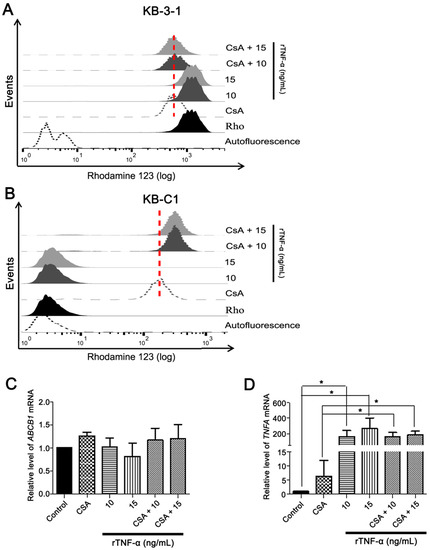 To inhibit Pgp function, KB-C1 cells were incubated with 10 µM CsA in the presence or absence of rTNF-α for 24 h. The cells were analyzed by flow cytometry for efflux activity and using qRT-PCR for messenger RNA (mRNA) expression levels of ABCB1 and TNFA.