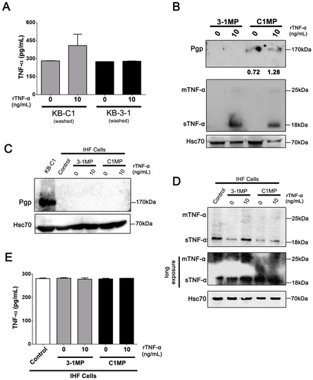 Analysis of microparticles (MP) content derived from parental and MDR cells and its effects in the IHF cell line. (A) Comparison of soluble TNF-α secretion in supernatant of KB-3-1 and KB-C1 cells treated for 24 h with 10 ng/mL rTNF-α, determined by ELISA. (B) Immunoblot analysis of Pgp and endogenous TNF-α protein levels in 3-1MP and C1MP derived from non-treated or 10ng/mL rTNF-α treated cells. Western blot bands were quantified by densitometry. Immunoblot analysis of (C) Pgp and (D) TNF-α protein levels in IHF cells after 24 h of incubation with 3-1MP or C1MP derived from non-treated or 10 ng/mL rTNF-α treated cells. (E) Comparison of soluble TNF-α liberation in supernatant of IHF cells treated for 24 h with 3-1MP or C1MP derived from non-treated or 10 ng/mL rTNF-α treated cells, determined by ELISA. Data are means ± SD of two independent experiments. One-way ANOVA with Dunn’s posttest post were used to analyze the ELISA results. (A) * p value = 0.406. MP derived from KB-3-1 (3-1MP); MP derived from KB-C1 (C1MP) cell lines.