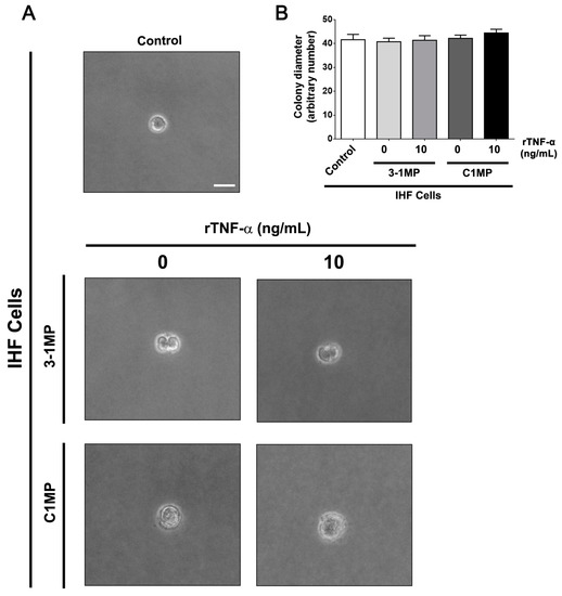 For the anchorage independent growth assay, 5 × 104 IHF cells were seeded and co-cultured with 3-1MP or C1MP for 48 h in each well of a 24-well plate. 3-1MP or C1MP were added daily. Following incubation, cells were tripsinized and 5 × 103 cells were resuspended in a medium containing MP and 0.6% agarose. The cells were seeded in duplicates in 6-well plates coated with 1.2% agarose-supplemented growth medium to prevent cell adhesion. After being plated, colonies were analyzed after 18 days in culture. Images were captured using Axio Observer.Z1 microscopy (Zeiss) under 20× magnification. Colony diameter was obtained measuring image pixels with the aid of a stage micrometer slide.