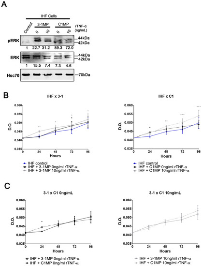 Proliferation rate of IHF cells after incubation with MP (microparticles) derived from parental and MDR cell lines. (A) Immunoblot analysis of ERK and phospho-ERK protein levels in IHF cells after incubation with MP derived from non-treated or 10 ng/mL rTNF-α treated KB-3-1 and KB-C1 cells. Western blot bands were quantified by densitometry. (B,C) Proliferation rate determined by crystal violet incorporation assay during 96 hour treatment with 3-1MP or C1MP derived from non-treated or 10ng/mL rTNF-α treated cells. Data are means ± SD of three independent experiments. Two-way ANOVA with Bonferroni posttest were used to analyze the crystal violet incorporation assay results. Black and gray asterisks represent statistical significance between MP derived from non-treated and rTNF-α-treated cells, respectively. * p < 0.05; ** p < 0.01; *** p < 0.005 indicate the statistical significance of data compared with non-treated cells or IHF incubated with 3-1MP.