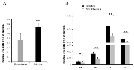 Mycoplasma gallisepticum (MG) infection generated gga-miR-146c upregulation. Relative gga-miR-146c expression in MG noninfected or infected DF-1 cells (A) and in 17 days to 20 days (8 to 11 days post-infection) chicken embryo lung tissues (B). RT-qPCR was performed to assess gga-miR-146c expression that normalized to 5S-rRNA. Uninfected groups served as negative controls. Values are mean ± SD, * p < 0.05, ** p < 0.01.