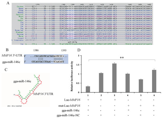 MMP16 is a target of gga-miR-146c. (A) Alignment of MMP16 3′-UTR from different species. The highlighted sequence is conserved region; (B) Alignments of gga-miR-146c and the target site in MMP16 3′-UTR. The highlighted part is gga-miR146c seed sequence; (C) Structure of gga-miR-146c and MMP16 3′-UTR target site. Red strand represents target sequence and green represents gga-miR146c; (D) Luc-MMP16 (3′-UTR) and either gga-miR-146c or gga-miR-146c-NC were co-transfected into cells. The dual-luciferase glow assay was performed 24 h transfection later. Data from three experiment results were mean ± SD. Two-tailed Student’s t-test, ** p < 0.01.