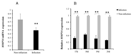 The miR-146 family has important regulatory functions in many diseases, including influenza, virus infection, and cancer [44]. gga-miR-146c was upregulated in chicken embryos lungs upon MG infection according to deep sequencing data [31]. In this study, we demonstrated that gga-miR-146c was remarkably upregulated in both cells (Figure 1A) and lungs (Figure 1B). It is further indicated that MMP16 is the target gene of gga-miR-146c (Figure 2D and Figure 3). MMP16 expression was significantly decreased in MG-infected DF-1 cells and chicken embryos (Figure 4). These results indicate that miR-146c might participate in MG infection by binding to 3′-UTR region of MMP16. Meanwhile, MG infection is a complex process, so there may be other factors regulating MMP16 expression. It remains to be further studied.