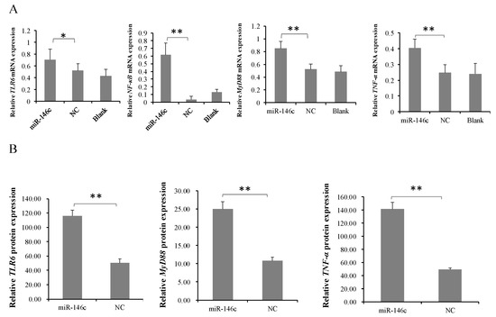 There were 6 × 103 DF-1 cells and 100 μL DMEM containing 10% (v/v) FBS in each well on six-well plates. Then plates were putted into an incubator overnight (39 °C, 5% CO2). When the cells grew to the right density, 7.5 pmol of miR-146c, miR-146c-NC, miR-146c-Inh, or miR-146c-Inh-NC and Lipofectamine 3000 were added to the six-well plates. In addition, the blank control was a mock transfection (marked as blank). The cells were collected after transfection of 48 h. Total RNA was extracted and purified, TransStart Top Green qPCR SuperMix (TRANSGEN) was used to mix with total RNA, then each RNA sample was tested by RT-qPCR on the CFX96 or CFX384 TouchTM (Bio-Rad). There were three independent transfections. We used the 2−ΔΔCt method to calculate the relative mRNA expression of TLR6, NF-κB p65, MyD88, and TNF-α [35].