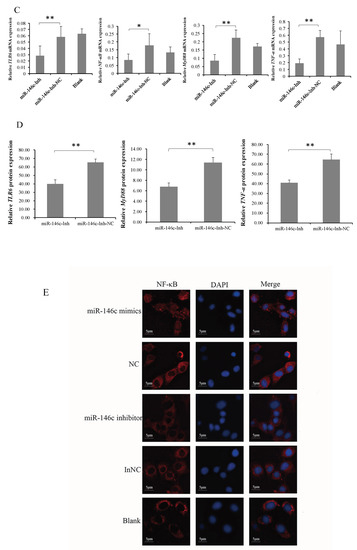 Luciferase assay was performed on 24-well plates with 2 × 105 DF-1 cells in per well. Lipofectamine 3000 (Invitrogen) was adopted to transfect the 10pmol of miR-146c, miR-146c-NC, miR-146c-Inh, miR-146c-Inh-NC, and 200 ng reporter plasmid into1 cells. Then, cells were fixed by 4% paraformaldehyde for 15 min at 48 h post-transfection. Nonspecific binding sites were blocked by incubating in 1% BSA for 30 min. Then incubate sections for 60 min with anti-rabbit NF-κB p65 antibody (diluted at 1:100). After another wash in PBS, NF-κB p65 antibody was incubated with goat anti-rabbit FITC-labeled IgG (1:1000, Bioswamp, Wuhan, China) at 37 ◦C for an hour. After washed, the cells were counterstained using DAPI. The stained macrophages were magnified 200× g.