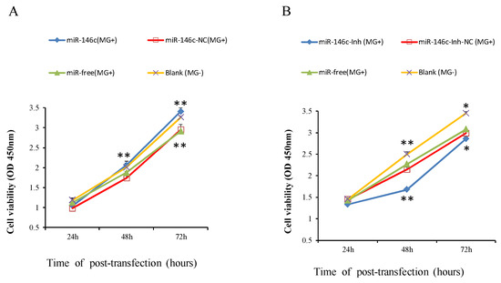 Proliferation of DF-1 cells was regulated by gga-miR-146c. Four groups of transfection treatments were carried out. Values are mean ± SD, * p < 0.05, ** p < 0.01. (A) Cell multiplication was dramatically promoted with gga-miR-146c overexpressed; (B) Cell multiplication was restrained by gga-miR-146c inhibitor.