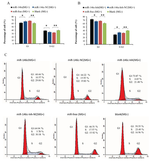 Cycle procession of DF-1 cells was affected by gga-miR-146c. Four groups of transfection treatments were carried out. Values are mean ± SD, * p < 0.05, ** p < 0.01. (A,C) Cell cycle was dramatically promoted with gga-miR-146c overexpression; (B,C) Cell cycle was suppressed by gga-miR-146c inhibitor.
