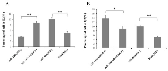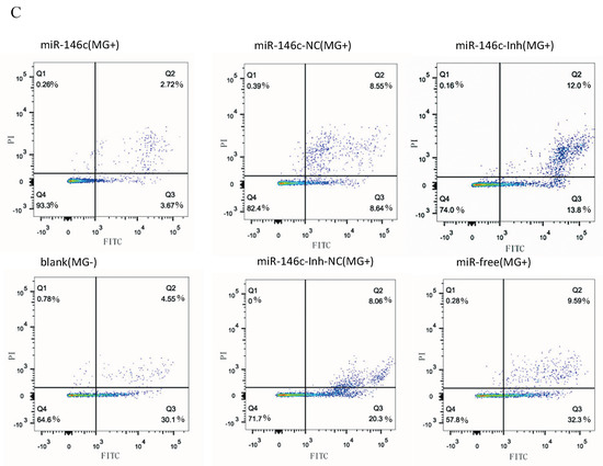 According to cell apoptosis analysis results, gga-miR-146c overexpression effectively decreased apoptosis rates compared to the miR-146c-NC (MG+) group or the miR-free group (MG+) (Figure 8A). Opposite results were obtained when cells were treated with a miR-146c inhibitor (Figure 8B).