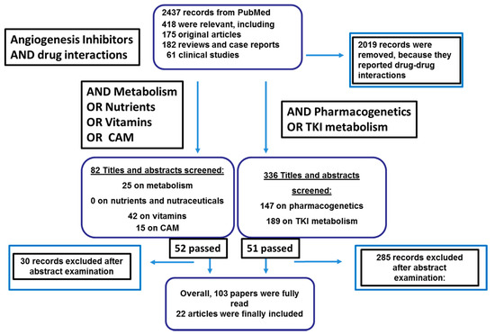 To establish the current knowledge of AI-N/DS interactions, the PubMed and Cochrane databases and the grey literature were searched for relevant papers using the keywords “angiogenesis inhibitors,” AND “drug interactions.” In the second step “metabolism”, “nutrients”, “herbal”, “Complementary and Alternative Medicines” (CAMs), and “vitamins” were added singly. In the third step, the search was further narrowed using the terms “pharmacogenetics” and “TKI metabolism”. There were no publication date constraints; the search was limited to the English literature. The 2437 papers retrieved by the search were examined by two authors (RDF and MB).