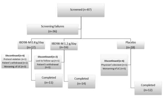 - NCT02493712. A Phase 2a, Multicenter, Randomized, Double-blind, Parallel Group, Placebo-controlled Trial of IBD98-M. Available online: https://clinicaltrials.gov/ct2/show/NCT02493712?term=IBD98M&cond=ulcerative+colitis&ran=1 (accessed on 18 March 2019).