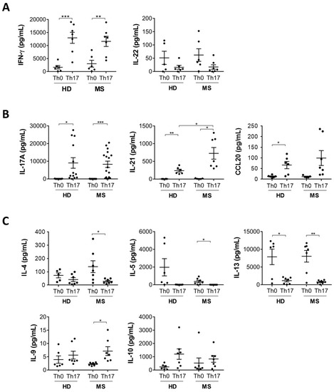 Given the pathogenic role played by Th17 cells in MS, we hypothesized that Th17 cells differentiated from MS patients and healthy donors would display a differential cytokine profile. To test this hypothesis, naive CD4+ T cells from healthy donors and RR-MS patients were differentiated in Th17 cells under in vitro culture conditions. We analysed the cytokines produced by polarized Th cells after 6 days of culture. First, we measured the production of ten Th profile-associated cytokines for the Th1, Th17 and Th2 subsets. Interferon (IFN)-γ, the prototypical Th1 cytokine, and IL-22, whose expression pattern is closely related to that of IFN-γ [10], are included in the Th1 category (Figure 1A). The Th17 class of cytokines includes IL-17, the prototypical Th17 cytokine, IL-21, produced by Th17 cells and involved in the autocrine enhancement of their differentiation, and CCL20, the ligand of CCR6, which enables the entry of Th17 cells into the CNS (Figure 1B). A third set of cytokines produced mainly in Th2 conditions includes IL-4, IL-5, IL-13, IL-9, and IL-10 (Figure 1C). As expected, we observed the upregulation of Th17 cytokines and IFN-γ in Th17 compared to Th0 conditions, in both healthy donors and MS patients (Figure 1A,B). Typical Th2 cytokines (IL-4, IL-5, IL-13) were decreased in Th17 compared to Th0 conditions, while IL-9 and IL-10 were produced by Th17 cells, although not upregulated compared to Th0 (Figure 1C). While most of these cytokines were similarly modulated in MS and healthy donors (Figure 1A–C), we found that the expression of IL-21 was significantly higher in MS compared to healthy donors (Figure 1B), indicating a possible role for this cytokine in Th17-related MS pathogenesis.