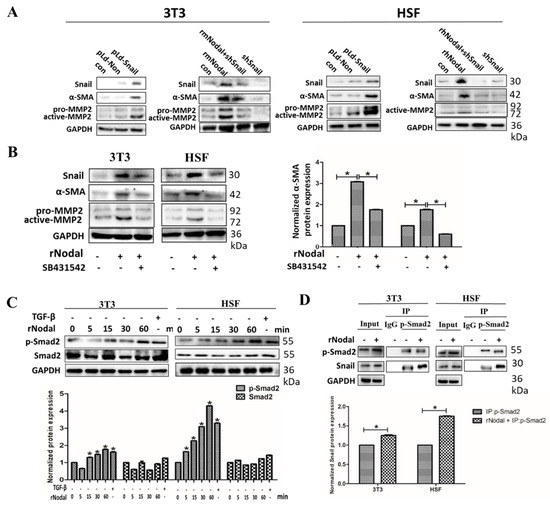 Snail contributes to fibroblasts differentiation induced by Nodal via TGF-β signaling pathways. (A) 3T3 and HSF cells were transfected with pLd-Snail or treated with Nodal protein in the absence or presence of the shSnail plasmid, and the expression of Snail, α-SMA, and MMP2 was determined by western blot. (B) 3T3 and HSF were pretreated with or without SB431542 (20 μM) for 2 h and then treated with Nodal protein (600 ng/mL) for 48 h. The expression of Snail, α-SMA, and MMP2 was analyzed by western blot (left) and the expression of α-SMA was quantitatively analyzed (right). (C) 3T3 and HSF cells were treated with Nodal protein for 5 min, 15 min, 30 min, and 1 h or TGF-β for 30 min. The total and phosphorylation level of Smad2, a key protein of the TGF-β signaling pathway, was detected by western blot (up) and quantitatively analyzed (below). (D) 3T3 and HSF cells were treated with Nodal protein (600 ng/mL) for 12 h, and then Snail was immunoprecipitated from equal amounts of lysates and the associated Snail and phosphorylated-Smad2 was analyzed by western blot (up) and the expression of Snail was quantitatively analyzed (below). * p < 0.05.