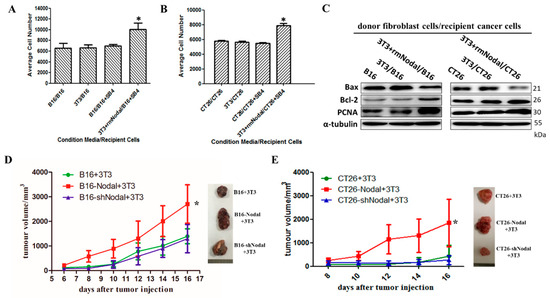 Fibroblasts activated by Nodal support tumor growth in melanoma and CRC. (A) B16 and (B) CT26 cells in the presence of SB431542 were grown in 3T3-conditioned media or 3T3-Nodal-treated-conditioned media without FBS for 48 h and the total number of cells was counted by Cell Counting Kit 8 (*p < 0.05). (C) The level of Bax, Bcl-2, and PCNA proteins from B16 or CT26 alone or co-cultured with 3T3 pretreated with Nodal protein were analyzed by western blotting. (D) Tumor growth curves of B16 + 3T3, B16-Nodal + 3T3, and B16-shNodal + 3T3 groups and the representative images of tumors are presented. (E) Tumor growth curves of CT26 + 3T3, CT26-Nodal + 3T3, and CT26-shNodal + 3T3 groups and the representative images of tumors are presented. * p < 0.05.